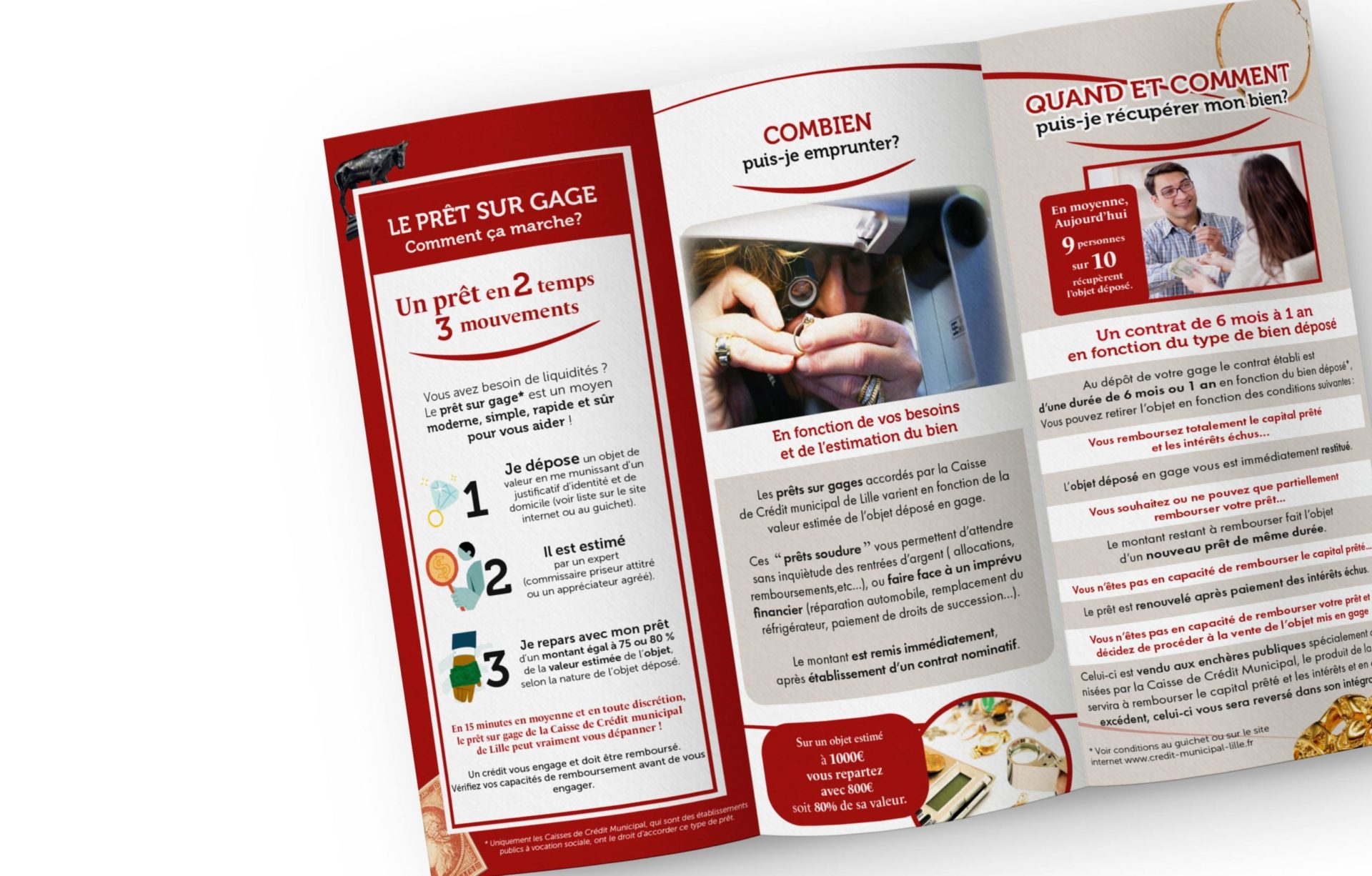 Documentations à télécharger Accueil / Le Crédit municipal / Documentations Nos dépliants et brochures Accèder à la documentation en ligne du Crédit Municipal de Lille et téléchargez les en cliquant sur les visuels miniatures. Mode d'emploi du Prêt sur GageFormat PDF Conseils BudgétairesFormat PDF Le Micro-CréditFormat PDF La Médiation BancaireFormat PDF Ca peut vous intéresser ... Le prêt sur gage Comment ça marche ? en savoir plus Médiation La procédure en 3 étapes en savoir plus Ventes aux enchères Les dates à venir en savoir plus